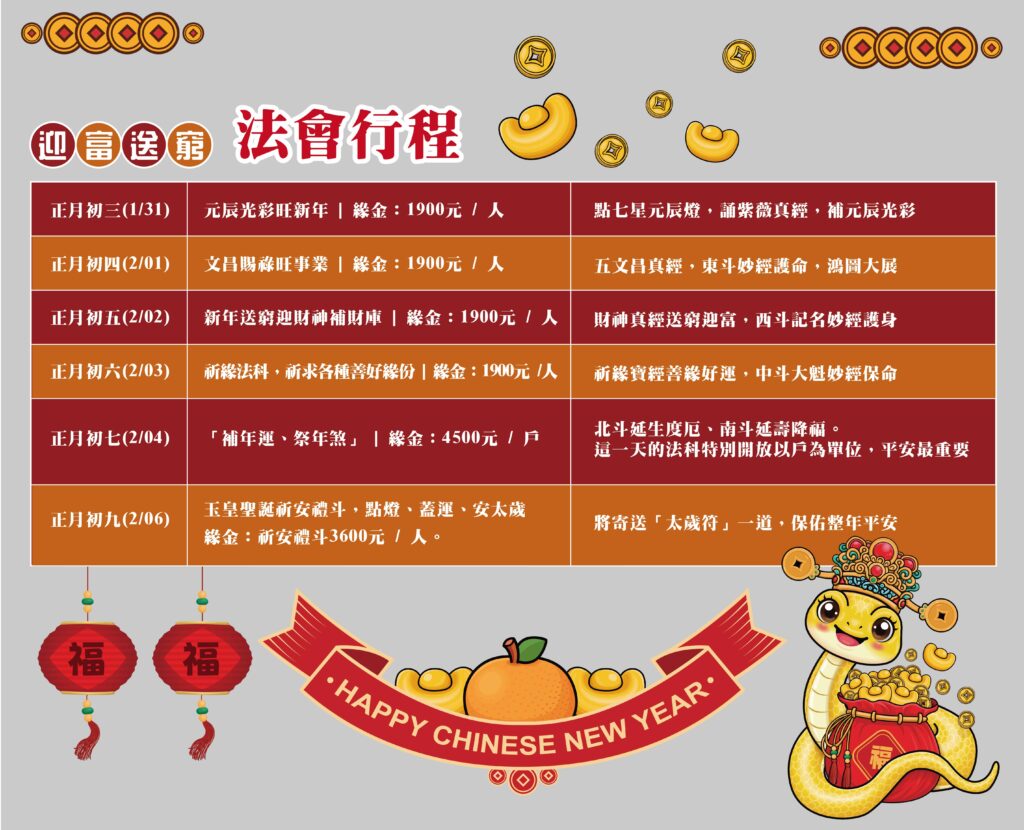 今年過年新春禮斗大全包法會,安太歲、蓋運、點燈 + 初三到十五科儀 + 一年一度補年運、祭年度煞神 + 送窮神迎財神 + 祈安禮斗 + 上元天官祈福手書。