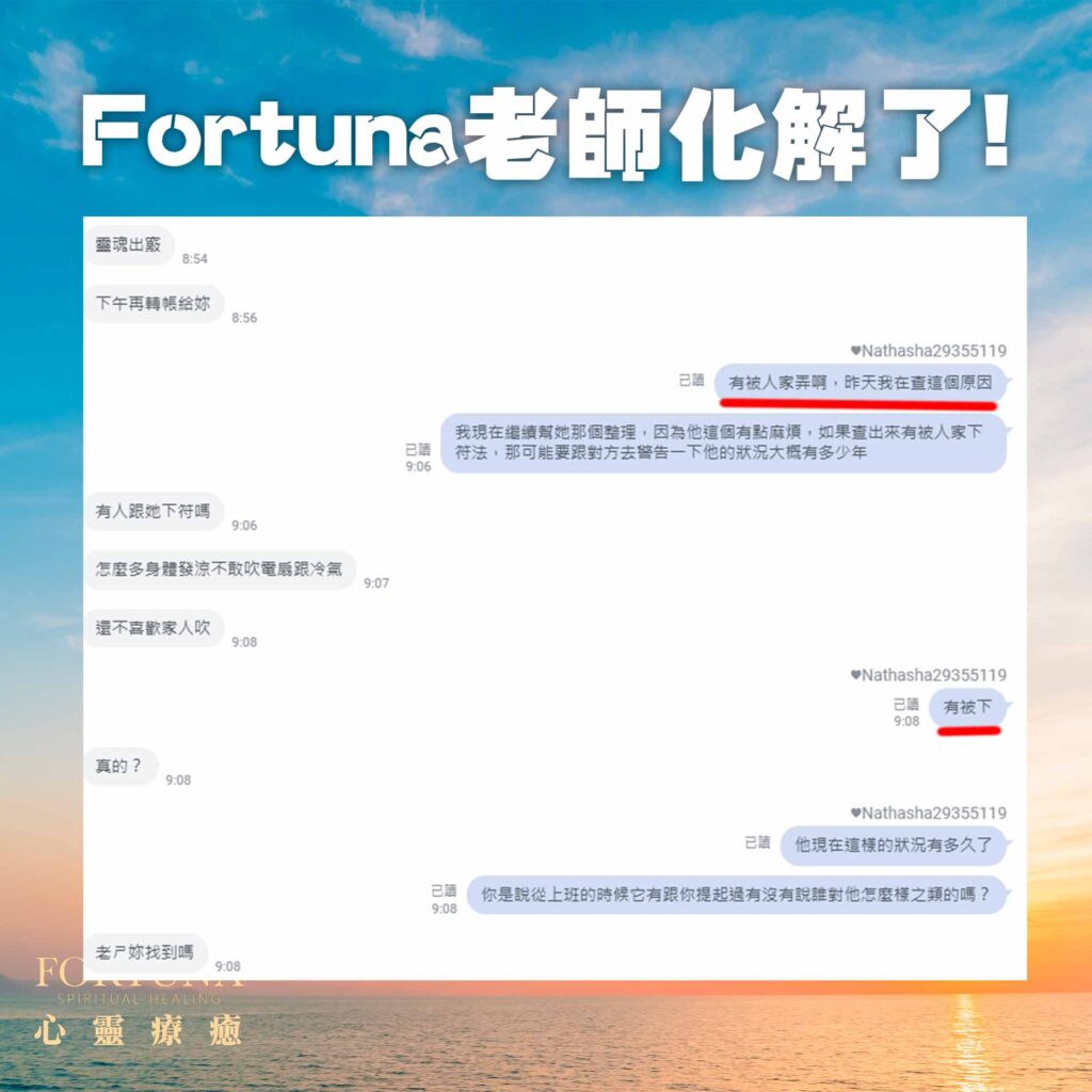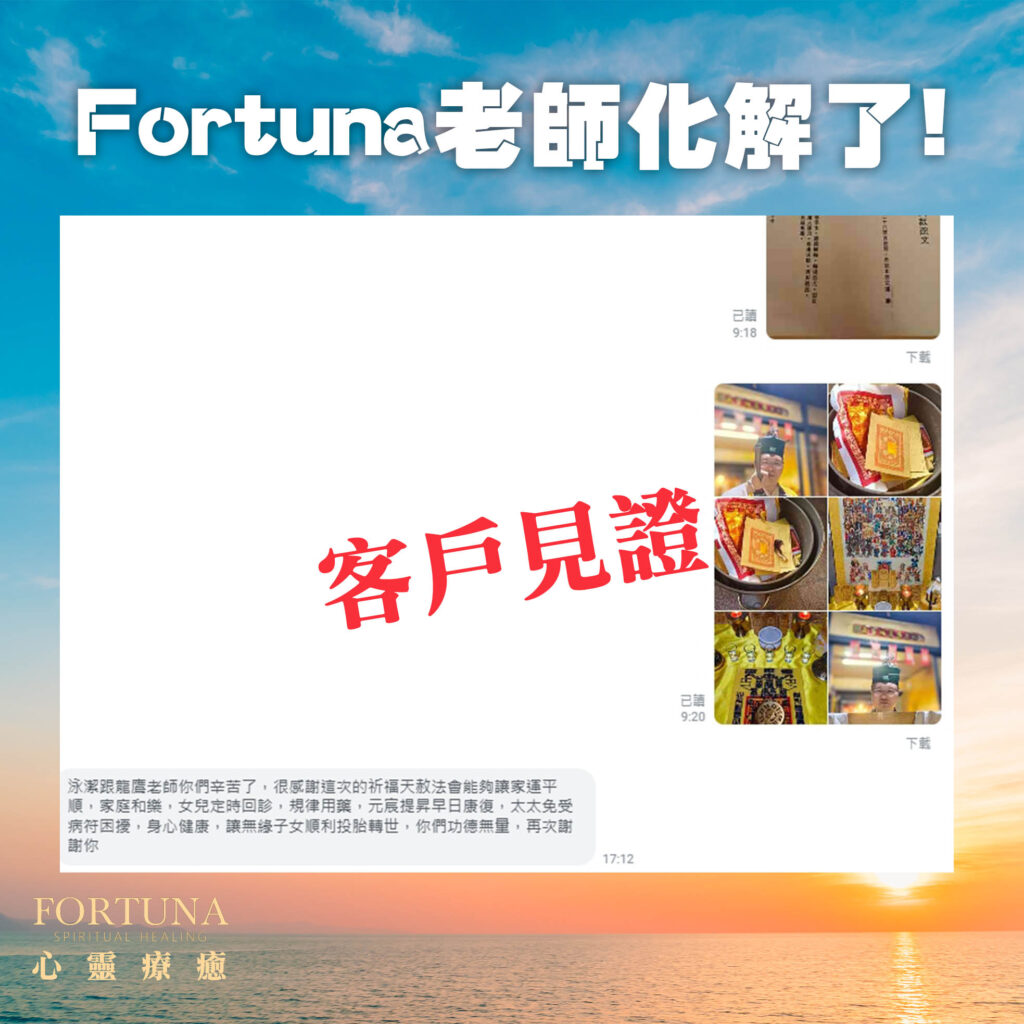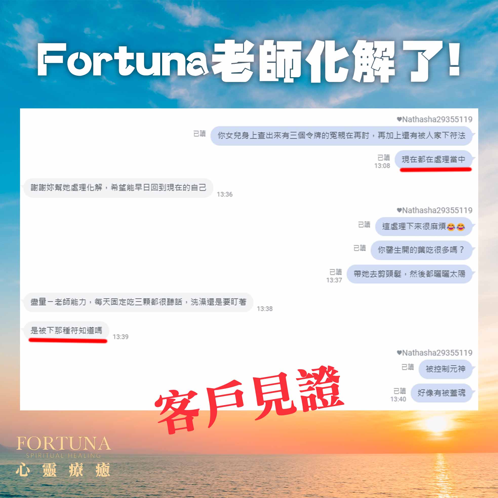 還好這一家的主人有找到Fortuna老師求救,老師每天鬥法保護受害者,花了很多的精氣神,現在事情仍在解決中,過了幾天,這家主人回應病情有逐漸進步了!